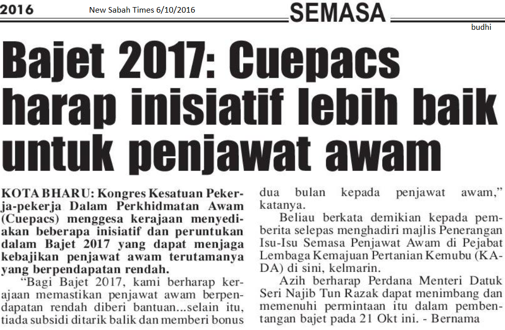 Blog Koleksi Akhbar Pendidikan New Sabah Times Bajet 2017 Cuepacs Harap Inisiatif Lebih Baik Untuk Penjawat Awam