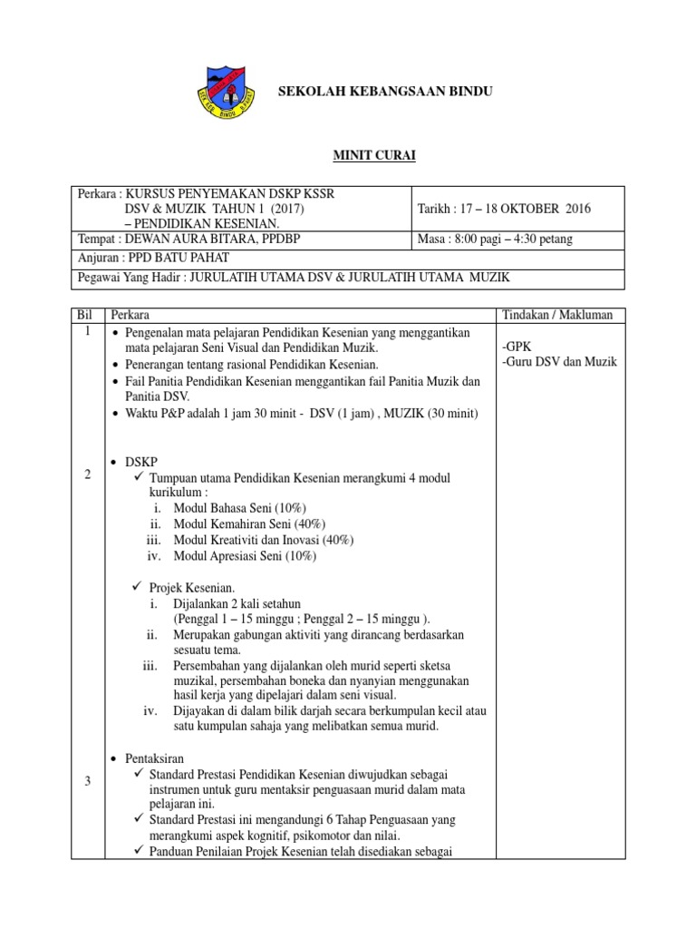 Minit Curai Kesenian Tahun 1 Docx
