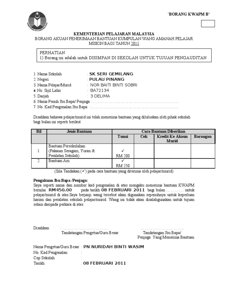 Kementerian Pendidikan Malaysia Borang Akuan Penerimaan Kad Pengenalan Saksi Borang Akuan Penerimaan Bantuan Kumpulan Wang Amanah Pelajar Miskin Bagi Tahun Pdf Document