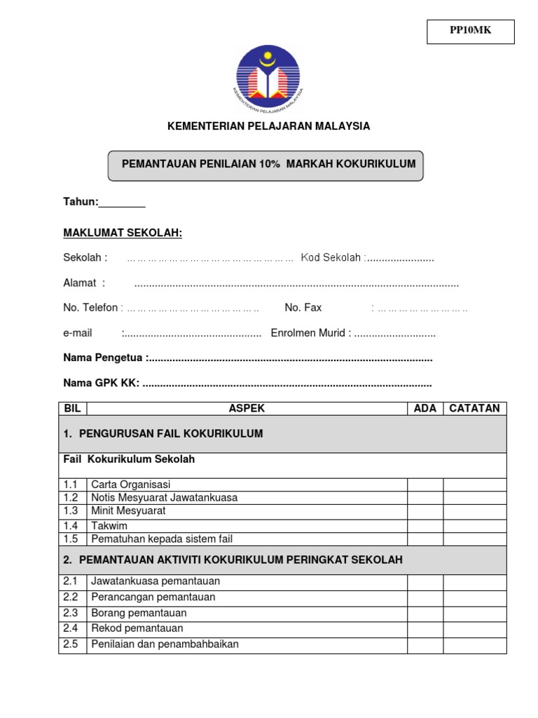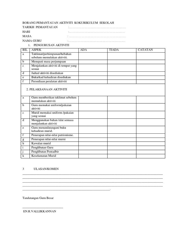 Borang Pemantauan Aktiviti Kokurikulum Pdf Document
