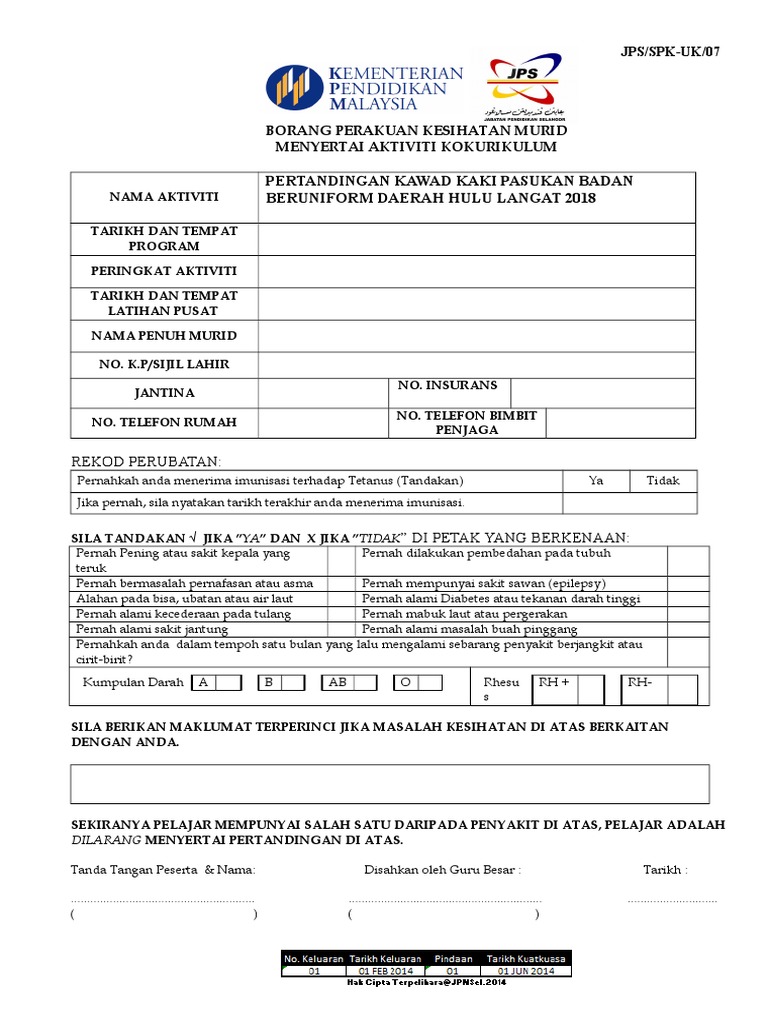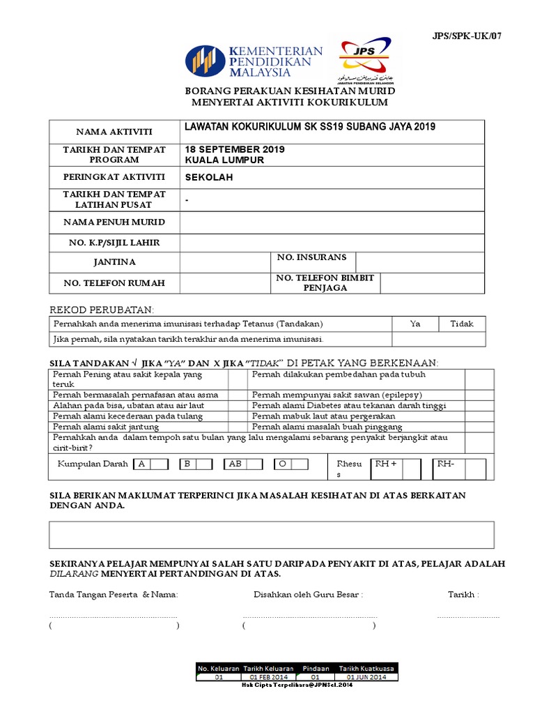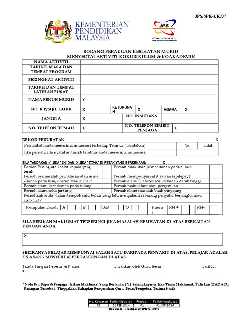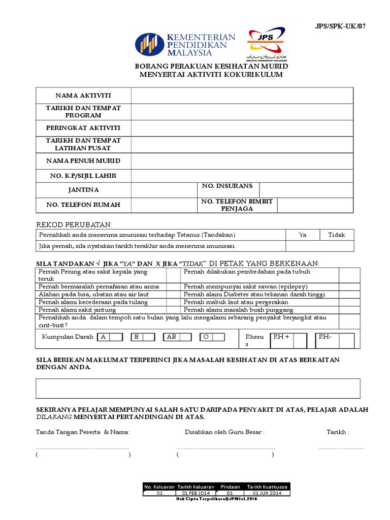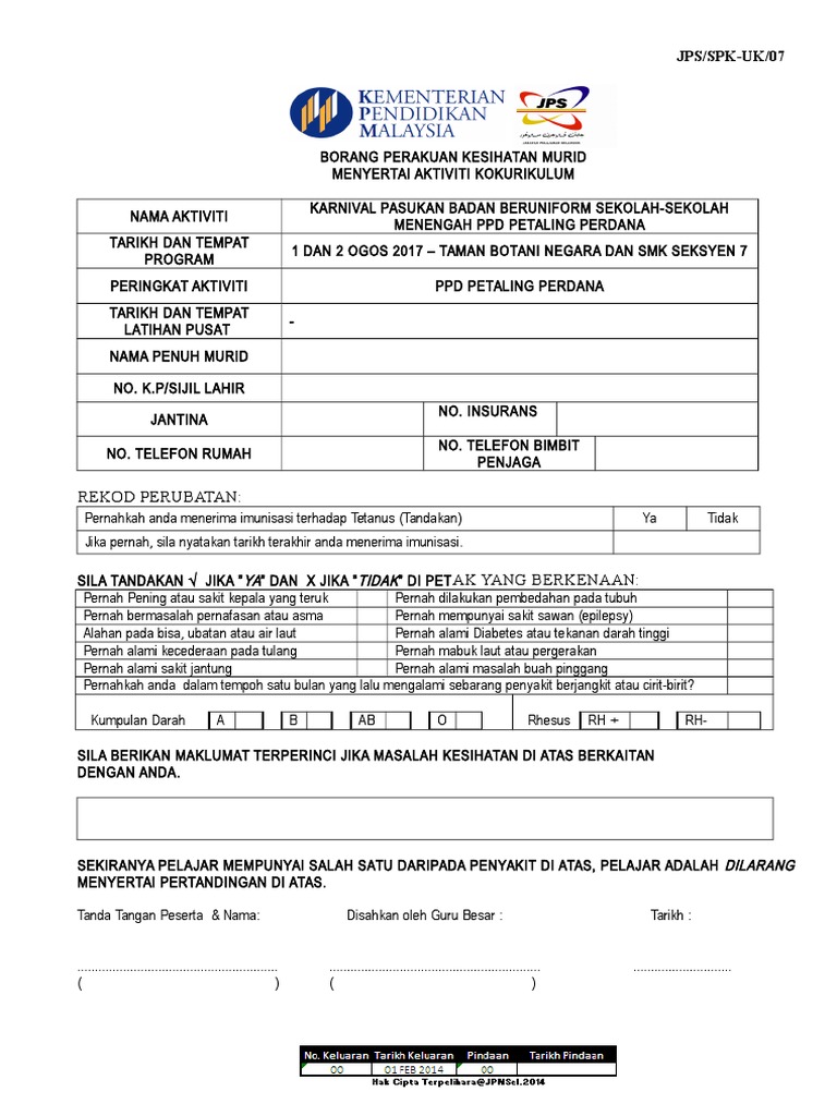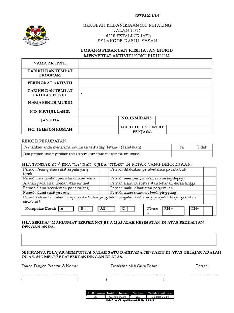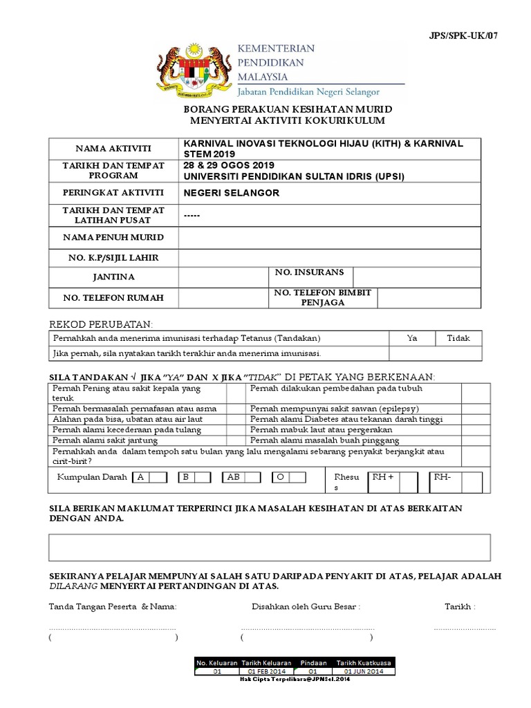 Borang Perakuan Kesihatan Murid Menyertai Aktiviti Kokurikulum
