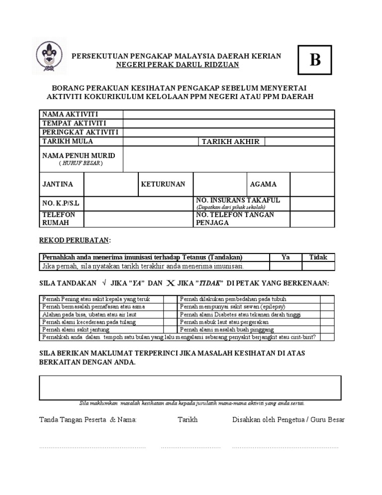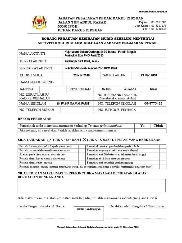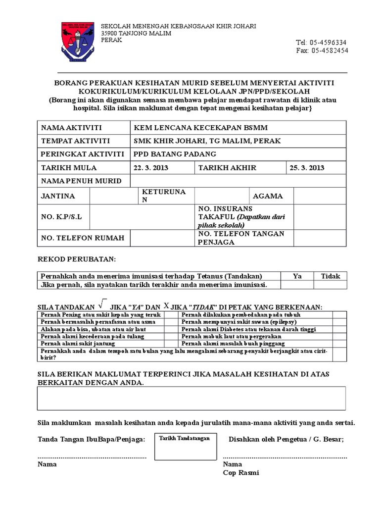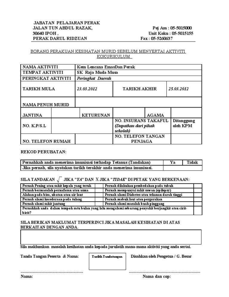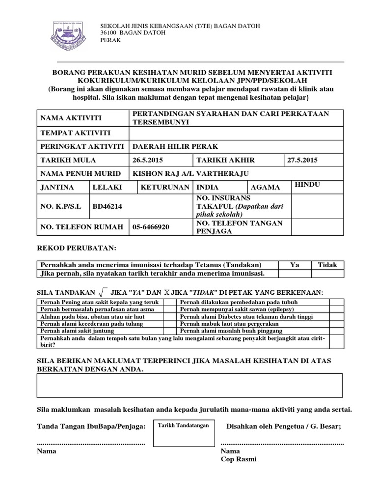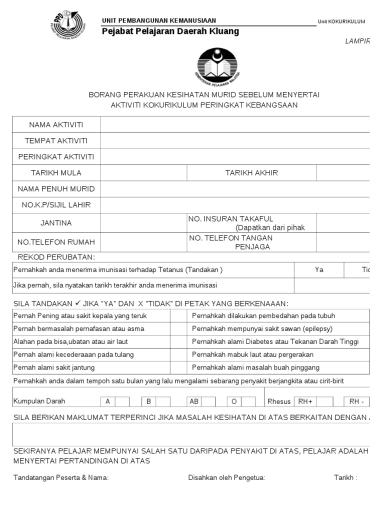 Surat Akuan Kebenaran Ibu Bapa Penjaga Lampiran 2 Borang Perakuan Kesihatan Murid Sebelum Menyertai Aktiviti Kokurikulum Luar Nama Aktiviti Tempat Aktiviti Peringkat Aktiviti Tarikh