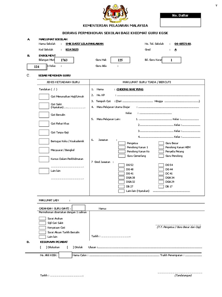 Borang Permohonan Bagi Jawatan Guru Ganti Kgsk