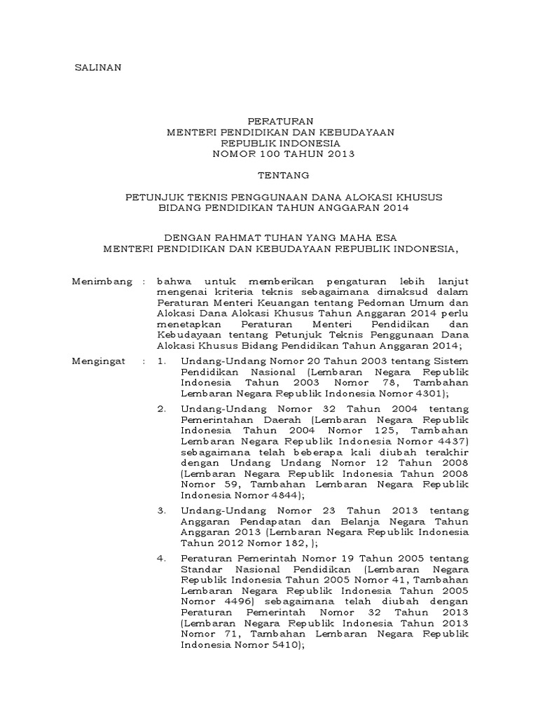 Permendikbud No 100 Tahun 2013