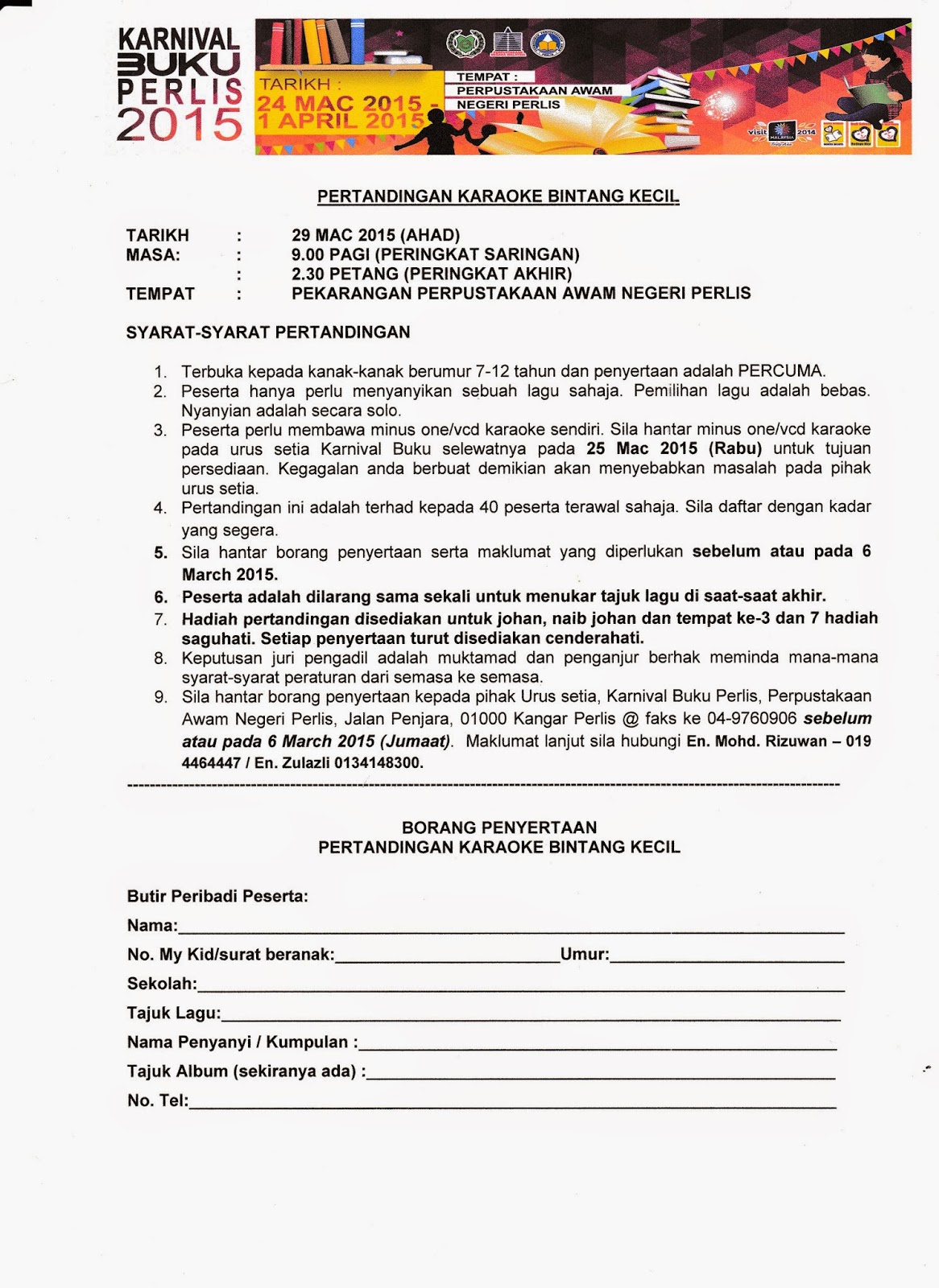 03 7873 0636 emel. Setiap peserta perlu nyatakan alamat emel kerana sijil penyertaan akan dihantar secara emel softcopy. Borang penyertaan dan syarat pertandingan akan dihantar ke semua sekolah sebelum hari pertandingan. Secara individu atau berkumpulan.