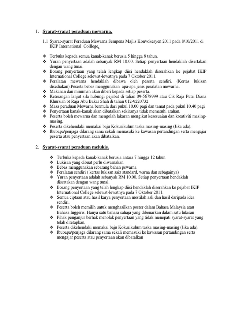 Peserta boleh menghantar seberapa banyak penyertaan. 4 pihak penganjur hanya menyediakan kertas lukisan. Peserta perlu membawa pensil warna alas lapik dan peralatan sendiri. Syarat syarat pertandingan 1.