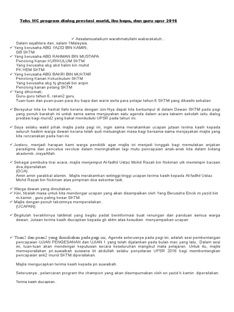 Teks Mc Program Dialog Prestasi Murid 2016 Tak Siap Lagi Doc