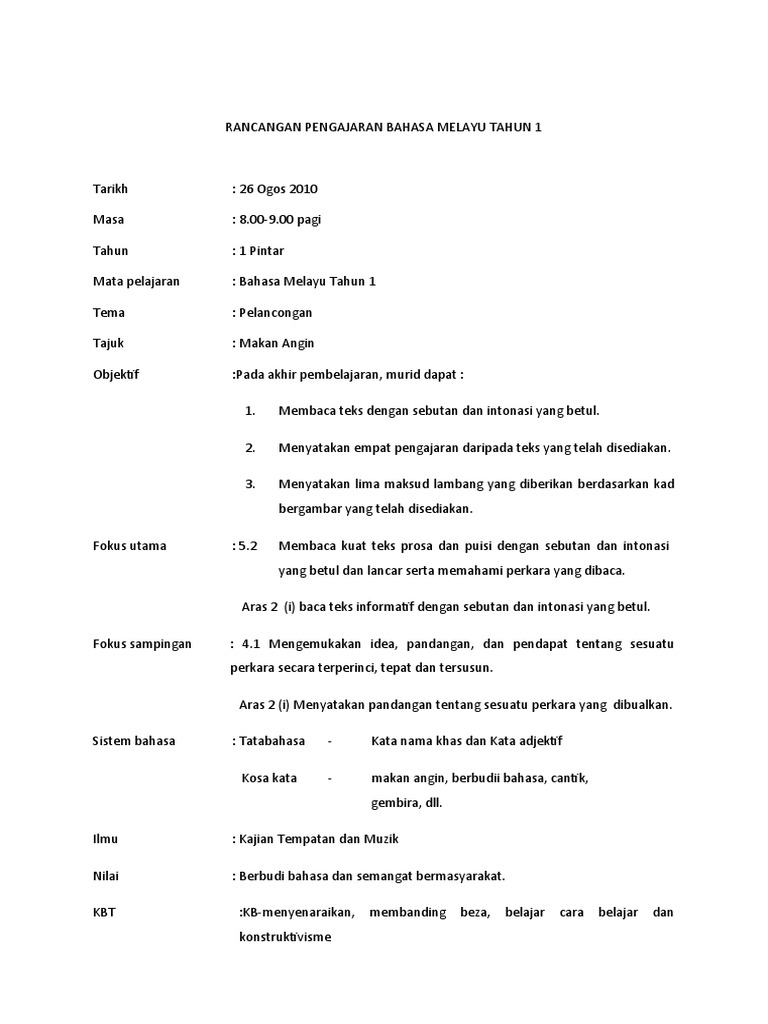 Contoh Rancangan Pengajaran Harian Bahasa Melayu Tahun 1 Kssr