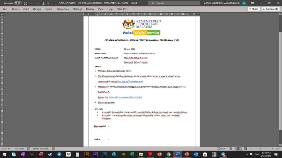 Contoh Template Catatan Aktiviti Guru Semasa Perintah Kawalan Pergerakan Mycikgu Net