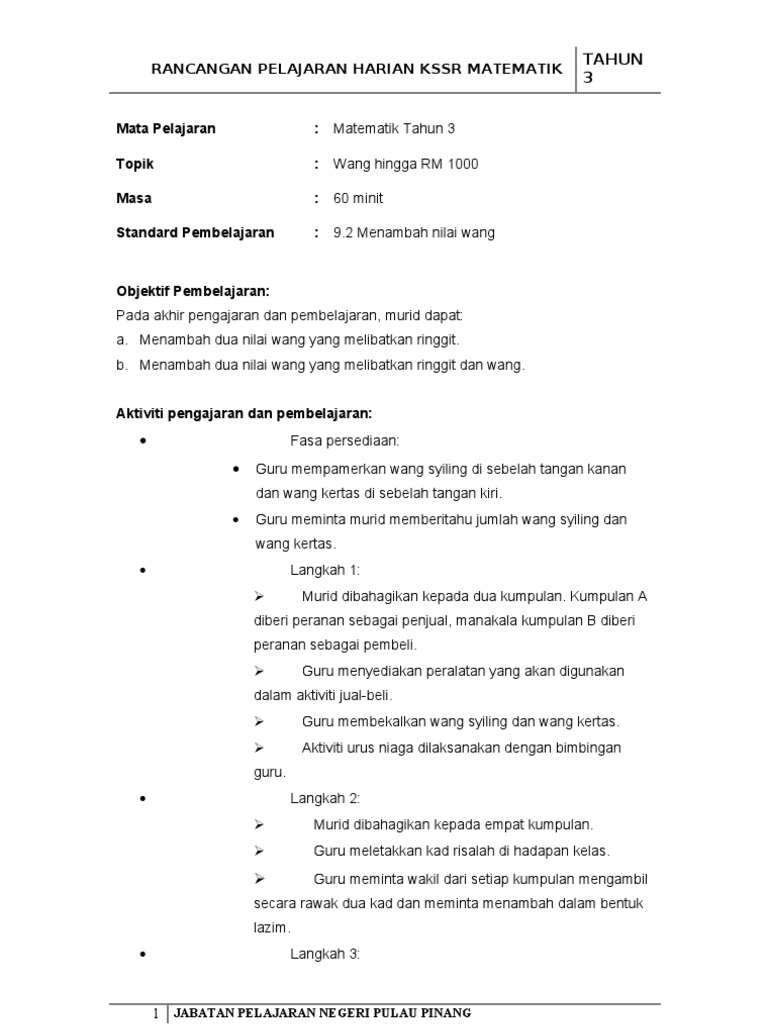 Template Rph Matematik Kssr Tahun 3 Wang