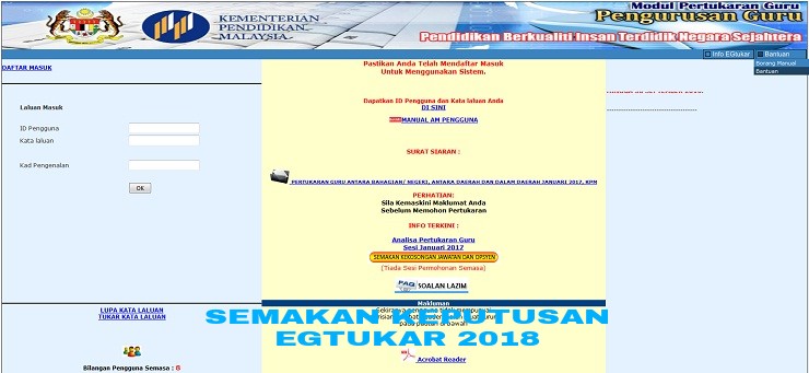 Permohonan dan semakan keputusan egtukar 2020. Semakan egtukar antara daerah dalam daerah boleh dibuat bermula 18 november bermula jam 6 petang di portal rasmi https epgo moe gov my pertukaran ini akan dibuat secara berperingkat iaitu sesi jun 2019 dan sesi januari 2020 dengan sekali permohonan sahaja. Portal rasmi kementerian pendidikan malaysia.