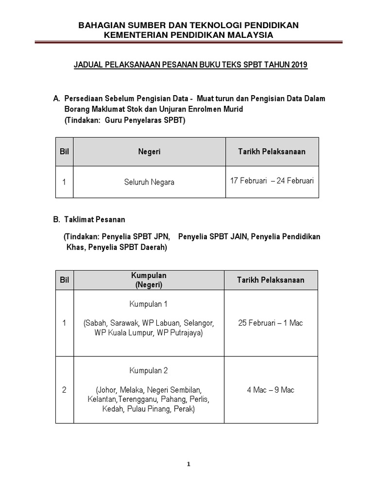 Jadual Pelaksanaan Pesanan Buku Teks Spbt Tahun 2019 Bstp Pdf